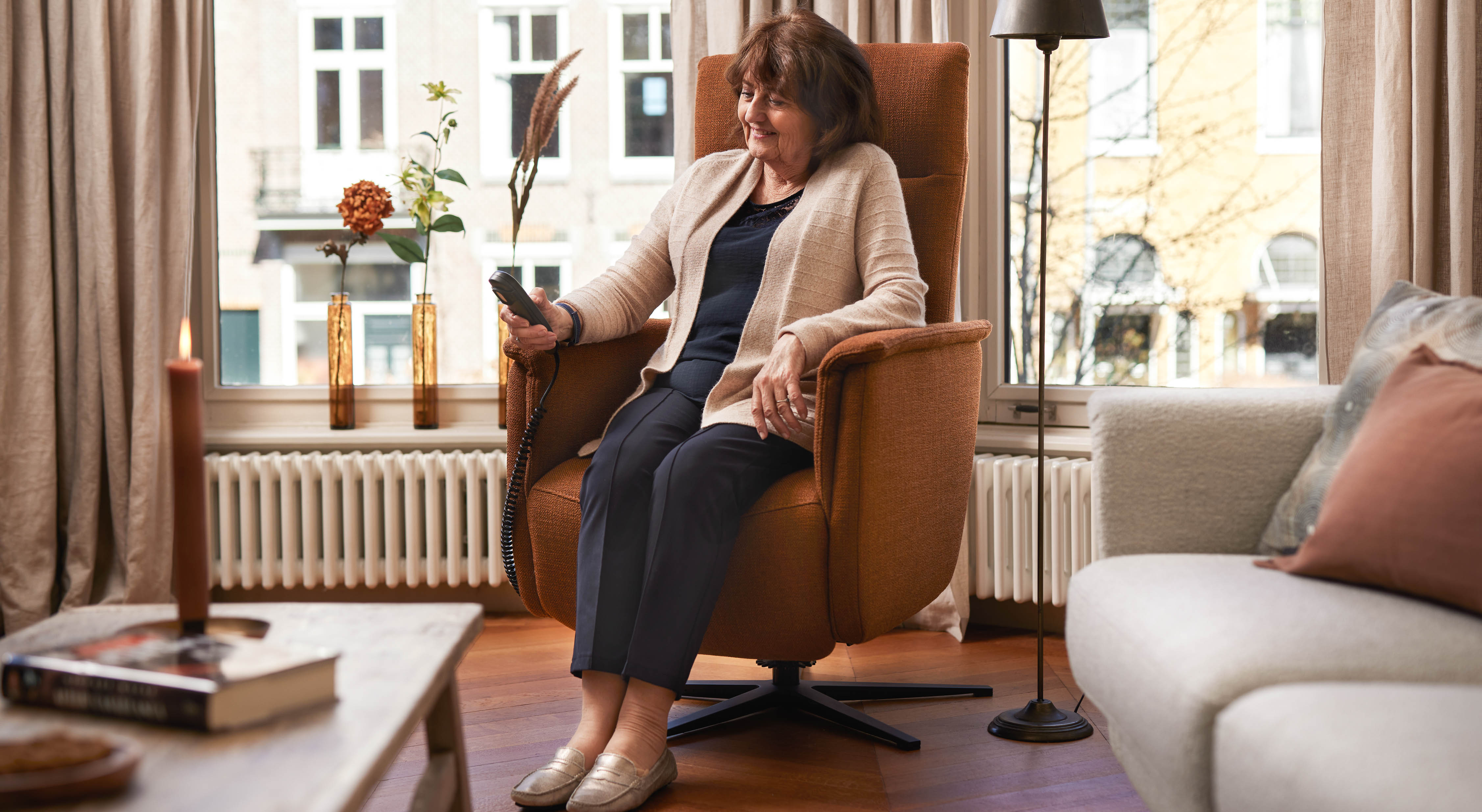 Een hele fijne functie is de sta-op functie. Met één druk op de knop staat u moeiteloos en veilig op. De stoel komt in een rustig tempo omhoog en kantelt iets voor voren, waardoor u richting een staande positie wordt gebracht. Zo kost opstaan u weinig kracht. Ook bij het plaatsnemen in de stoel is de sta-op functie prettig. U hoeft niet meer neer te ploffen, maar de sta-op functie brengt de zitting gelijkmatig weer naar beneden.