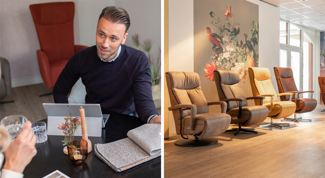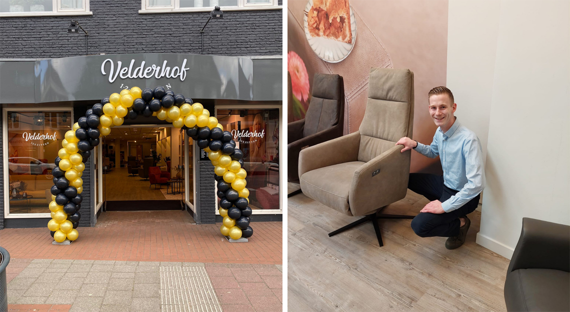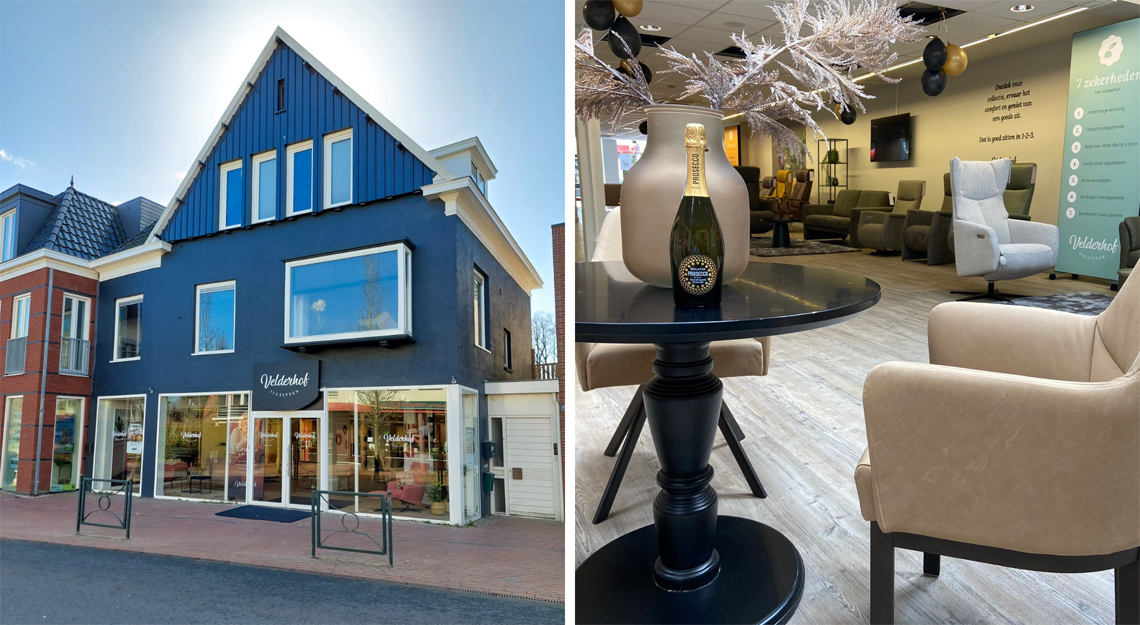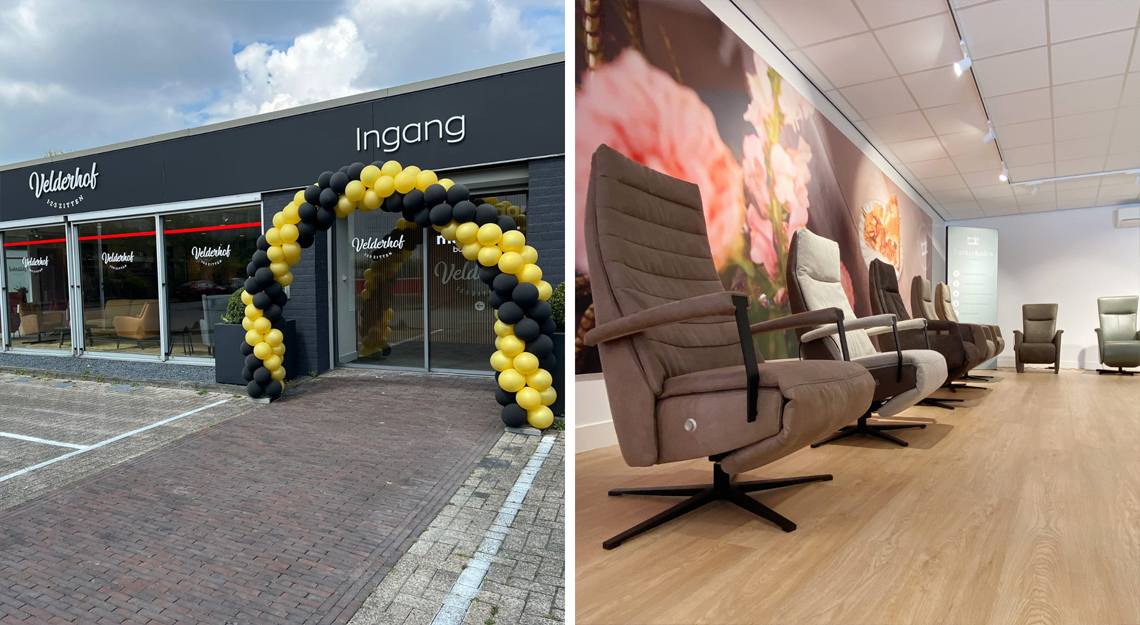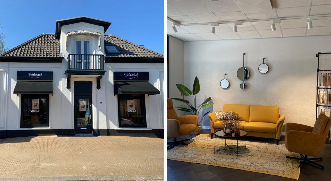 Volgens sommigen is het het mooiste pand van Apeldoorn. En wanneer u de winkel ziet, zult u vast begrijpen waarom. Door haar prachtige witte gevel straalt deze winkel allure uit. Eenmaal binnen merkt u dat de typische ‘Velderhofse gezelligheid’ ook hier aanwezig is. Met de hoge plafonds komen onze zitmeubelen nog beter tot hun recht. Onze adviseurs Collin en Naomi laten u graag onze uitgebreide collectie relaxfauteuils en andere zitmeubelen zien.