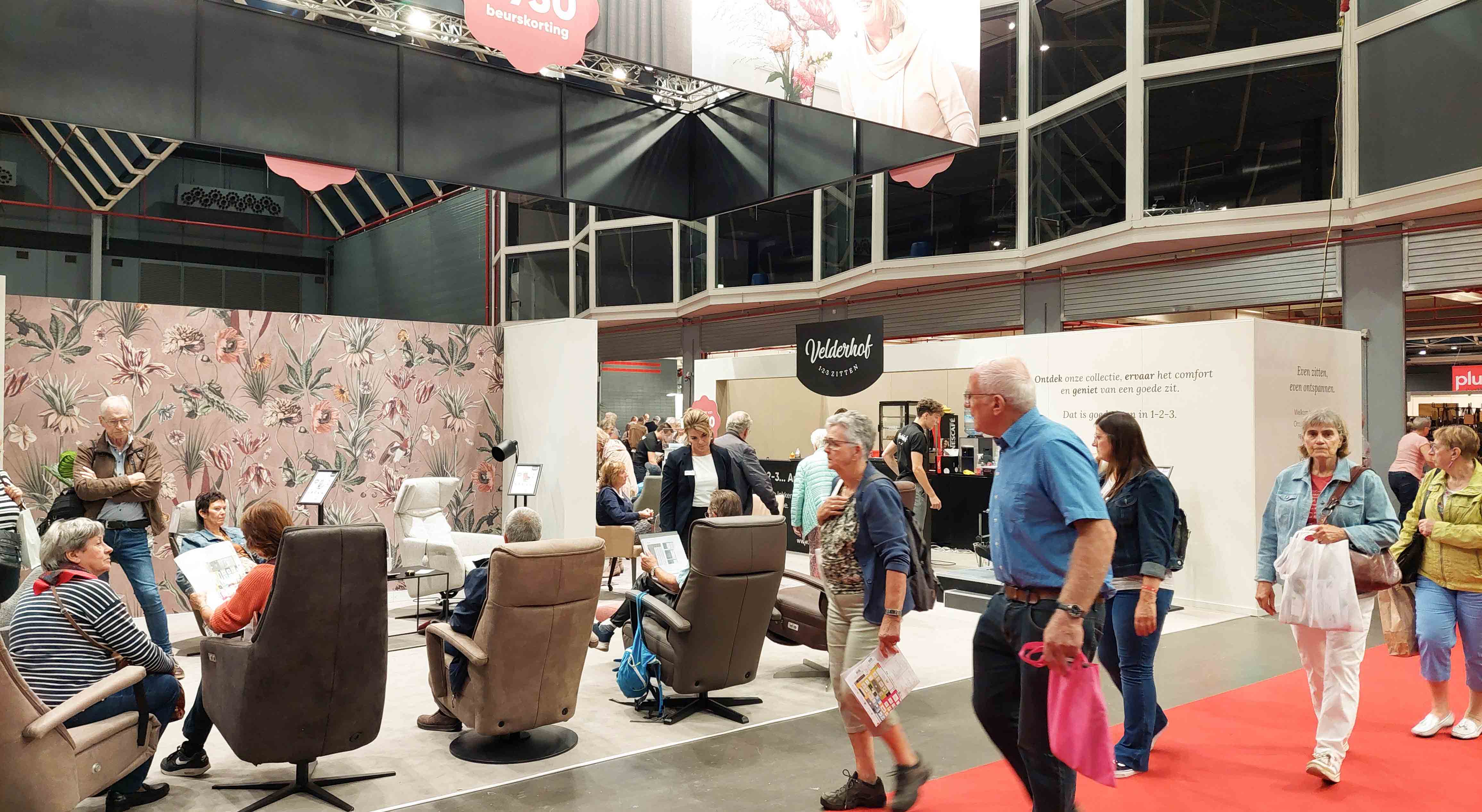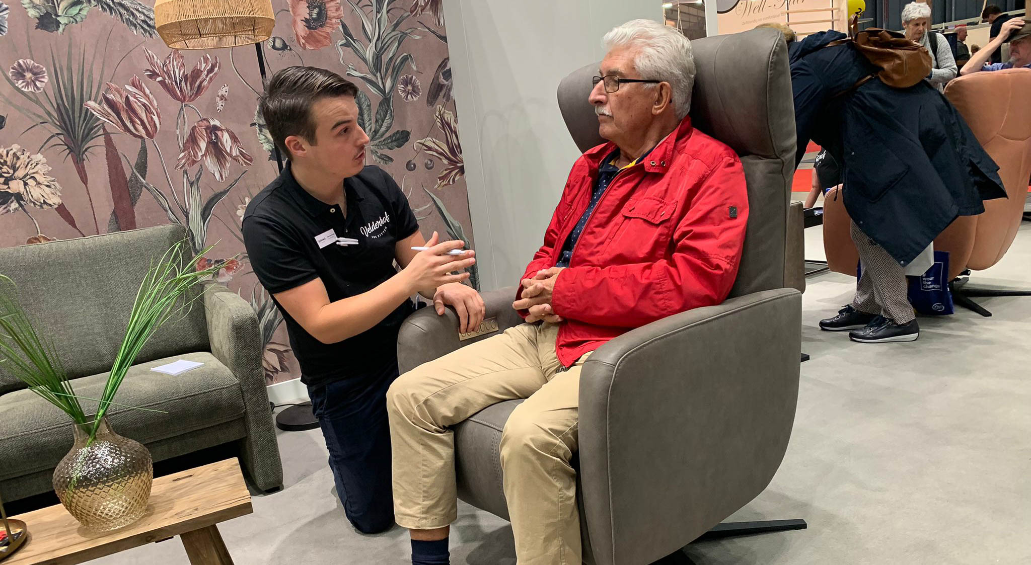 De beurs was dinsdag net geopend en de bezoekers stroomden binnen. Binnen een mum van tijd waren alle relaxstoelen en banken bezet. Natuurlijk hielp het mee dat we de bezoekers van onze stand verwende met koffie en een lekker stuk appeltaart. Dat viel in de smaak. Ook was het de ultieme plek om even bij te komen van het vele wandelen op de beursvloer. Een vrouw in het bijzonder ging zitten en riep verrukt uit: ”Eindelijk bungelen mijn benen niet meer!”. Ze gaf aan dat fauteuils altijd te hoog voor haar waren en ze nooit met haar voeten de grond kon raken. We hadden op de beursvloer een heleboel relaxfauteuils op een rijtje gezet, van klein naar groot. Zodat er voor iedereen een fijne stoel op ze stond te wachten.