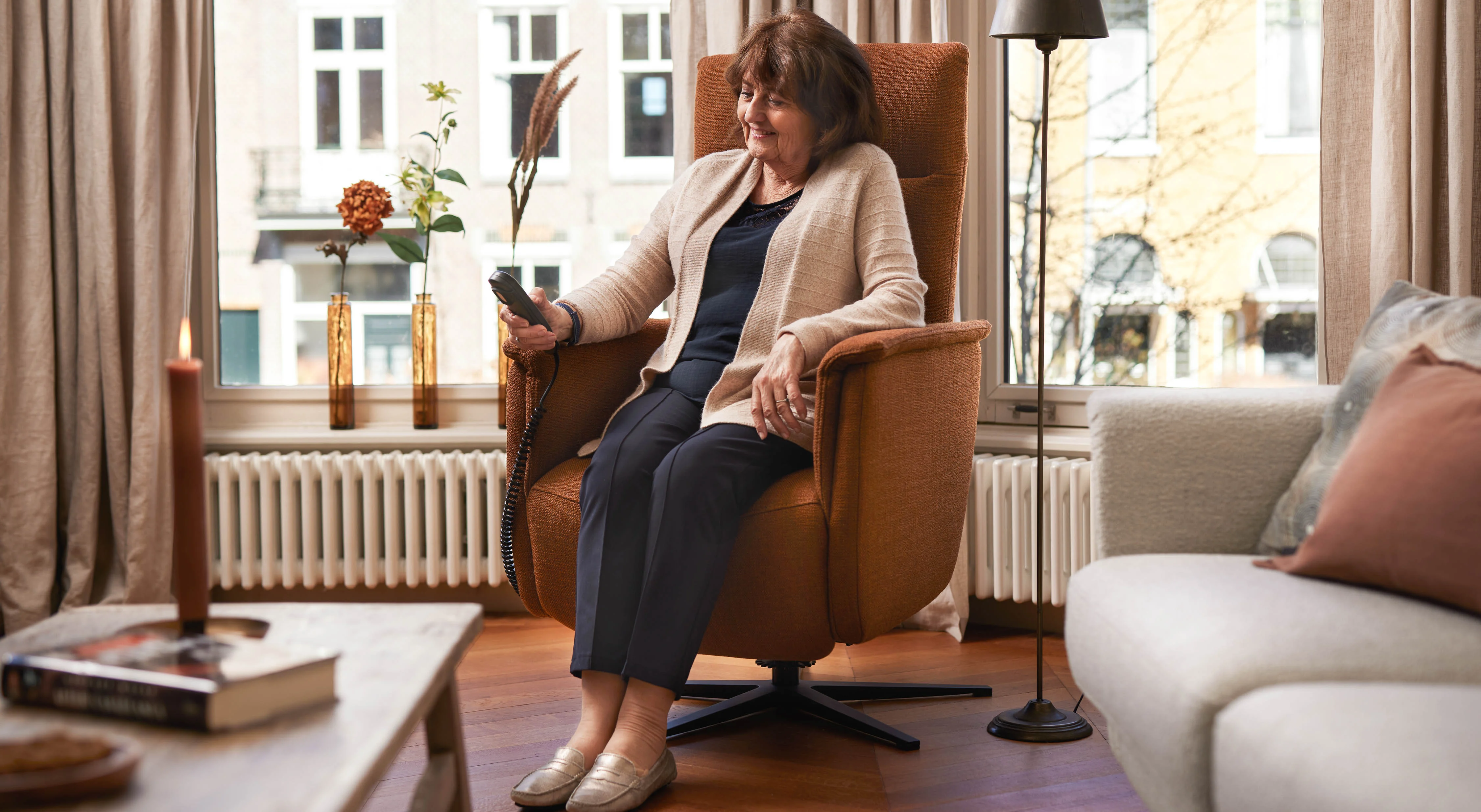 “Heb een tijdje terug bezoek gehad van het bedrijf Velderhof en erg goed advies gekregen over een sta-op stoel. Want na een valpartij ging opstaan niet meer soepel en tijdens het revalideren heb ik gemerkt hoe handig zo’n stoel is. Nu geniet ik van mijn prachtige sta op stoel Maggiore dankzij dit uitstekende advies.” - Annie