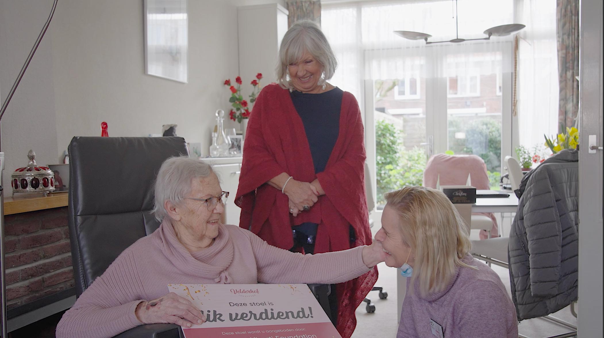 Op een koude winterse dag bezoekt Willeke een mevrouw uit Haarlem. Zij is aangemeld door haar wijkverpleegkundige Aliette. Aliette gunt haar deze stoel omdat mevrouw veel pech heeft gehad, ze was onlangs gevallen en had een gebroken rib en wervels. Aliette: “In de revalidatiekliniek had mevrouw een sta-op stoel en dat beviel heel goed. Eenmaal thuis miste ze deze toch wel. Ze is een hele zelfstandige dame en is erg begaan met andere mensen, daarom gun ik haar dit enorm.“ Ook spreekt Aliette haar bewondering uit naar mevrouw. Ze benoemt dat mevrouw altijd positief blijft, ondanks dat ze het soms erg moeilijk heeft.