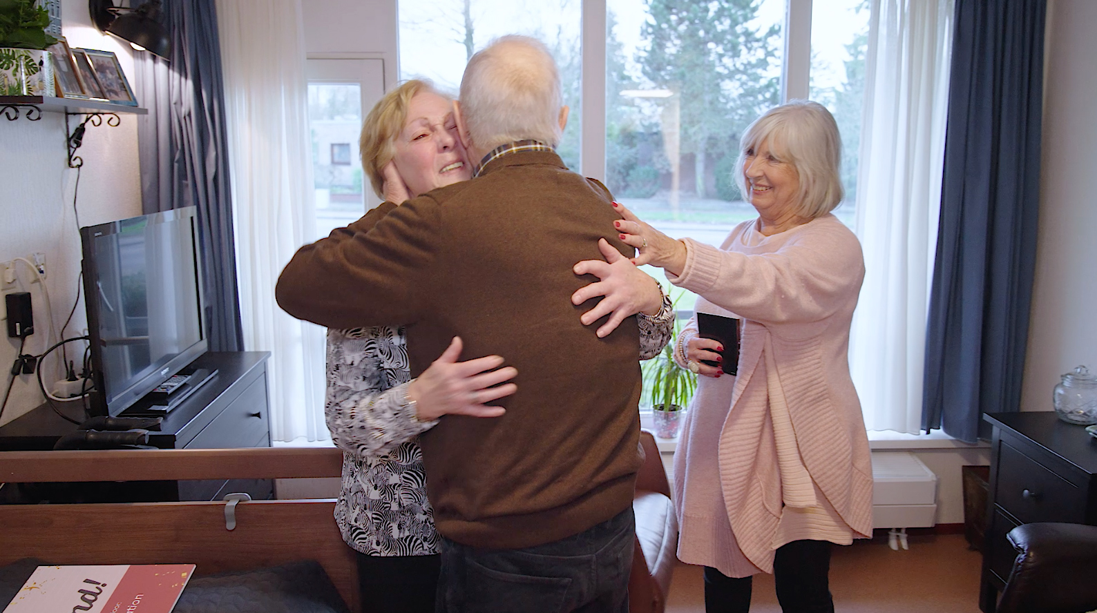 “Och wat mooi”, reageert Bob blij verrast terwijl hij de deur opent. Hij ontvangt iedereen hartelijk en zijn vrouw is zichtbaar geroerd. Ze vertelt dat het heel moeilijk was dat haar man ging verhuizen en Bob geeft haar een knuffel. Ze gunde haar man heel erg een nieuwe stoel en besloot een mail te sturen. Ze had er verder niet meer aan gedacht. Ze zegt: “Ik heb nog nooit wat gewonnen of gekregen, maar ik denk ik probeer het gewoon.” Het was dan ook een hele verrassing dat ze gebeld werd met de mededeling dat we langs wilden komen.