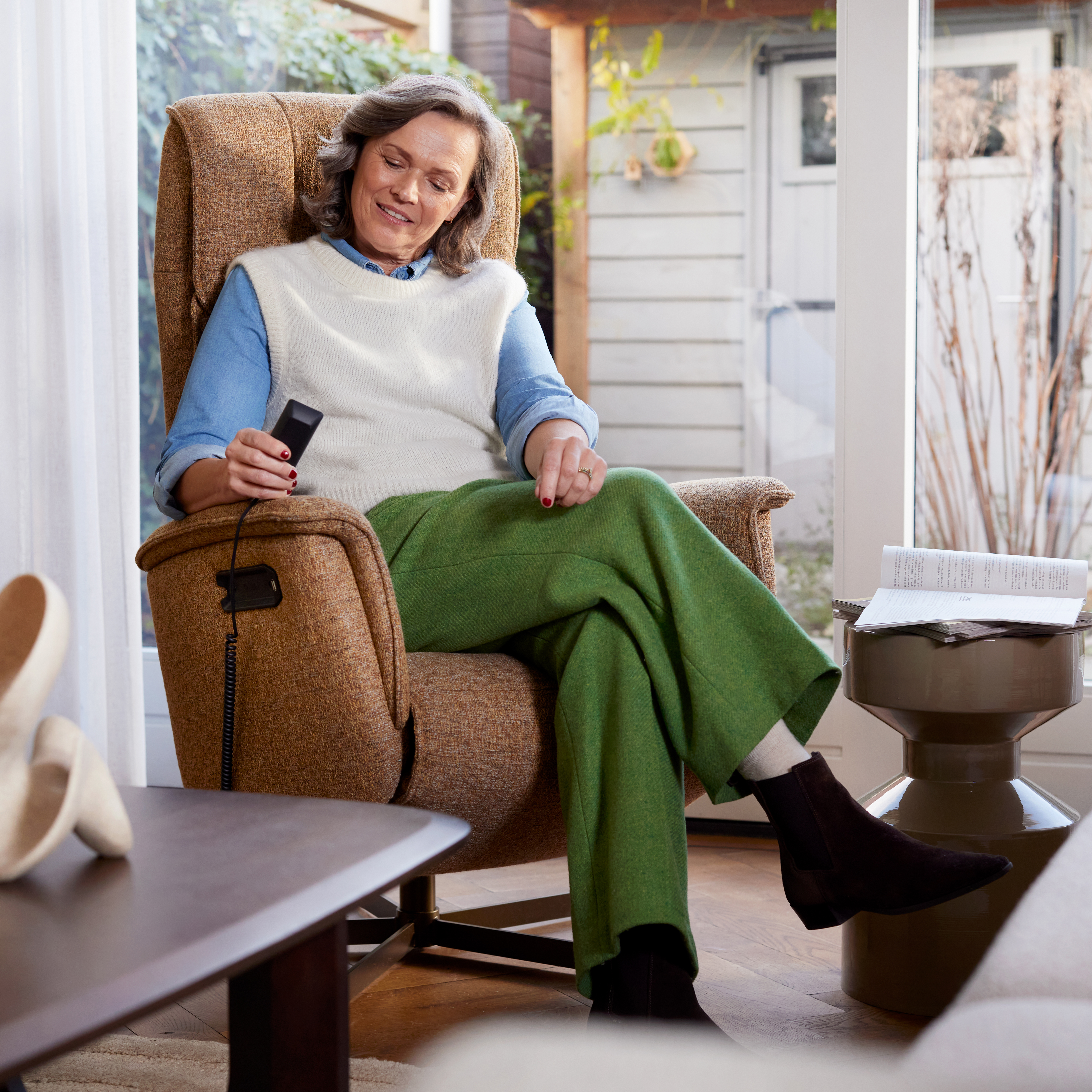 Met de elektrische bediening zet u uw stoel eenvoudig in de gewenste positie. U heeft de keuze uit bedieningstoetsen in de armleuning of een handige bekabelde afstandsbediening met extra grote knoppen en duidelijke pictogrammen. Het verstellen vraagt geen enkele inspanning, zodat u moeiteloos geniet van alle comfortopties.